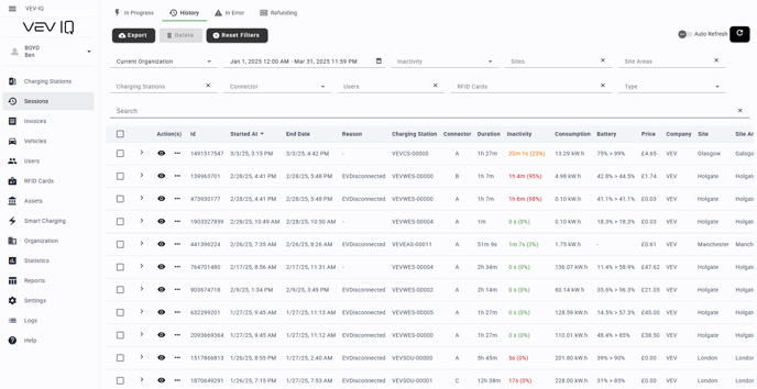 You can view historical sessions within VEVIQ, and filter by date, site, user and more. Within each, you can see the same data as you see in the live session, such as energy delivered, time charging and total inactive time, as well as pricing information.