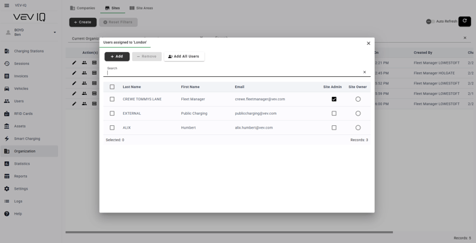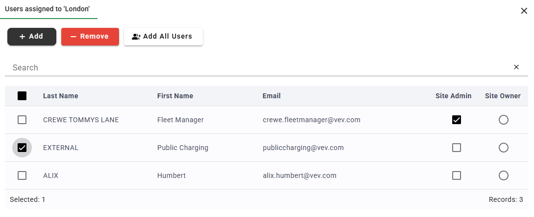 You can assign users to specific sites, allowing them to view and charge vehicles at those specific locations. Only 'Basic' users can be restricted to specific sites; administrators have access to all sites